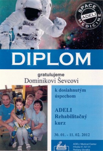Zo srdca by som sa chcela poďakovať všetkým, ktorí nám pomohli dostať sa na rehabilitačný pobyt v Adeli, ktorý je finančne nákladný. No vďaka vám sa nám to podarilo a mohli sme vyskúšať túto rehabilitáciu. Po nej je Dominik pevnejší, posilnil svalstvo a roztiahli sa mu achilovky. Veríme, že pri ďalšom pobyte sa posunieme o ďalší krôčik vpred aj keď to ide pre nás veľmi pomaly  je hlavné, že to ide. Dúfam,že sa nájdu ešte takí ľudia ako vy a že sa nám  znova podarí dostať do Adeli. Za všetko ďakujeme naším darcom, Domink s rodinou